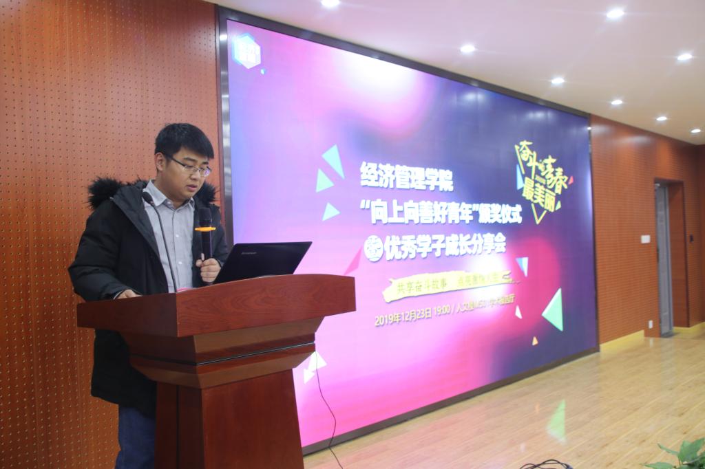 随后,在第二环节,三位优秀经管学子进行了成长分享。农经1602班的王安邦讲述了自己在华农的学生工作经历、创业经历和实践经历,充分表现出他对农业经济蓬勃发展的不懈追求。“做事不做官,出力不出名。”这是他对学生工作的深刻理解。同时,他还谈到同学们要懂得感恩,感恩学校、学院为我们提供一方读书净土,感恩老师三尺讲台上的无私栽培,感恩父母的养育之恩和声声教诲,感恩书籍的包罗万象,感恩自己的默默坚持和努力追求。