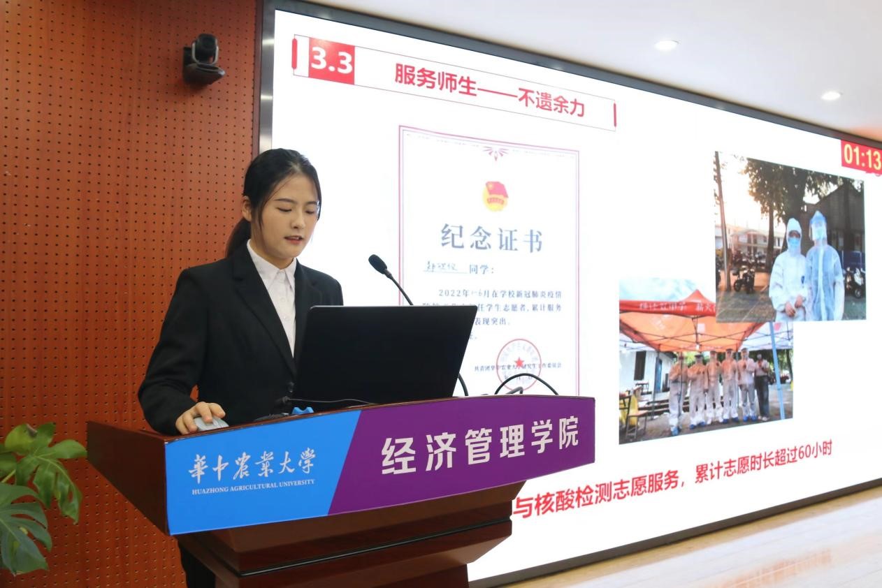 10月18日晚,yl6809永利集团2022年研究生国家奖学公开评选答辩会在人文楼M501举行。经过个人申请、学院初审,共有11名硕士研究生、6名博士研究生进入到终审答辩环节。候选人围绕学习情况、科研成果、学术会议、社会实践、志愿服务、成长感悟等方面进行展示汇报,评委由学院领导、教师代表和学生代表组成。学院党委书记陈国顺、院长李谷成、党委副书记刘三宝、副院长于久霞,陶建平、周德翼、齐振宏、刘灵芝、何坪华、熊航等教授代表,及学院研究生工作办公室乔学琴、陈曙等出席评选答辩会并担任评委。