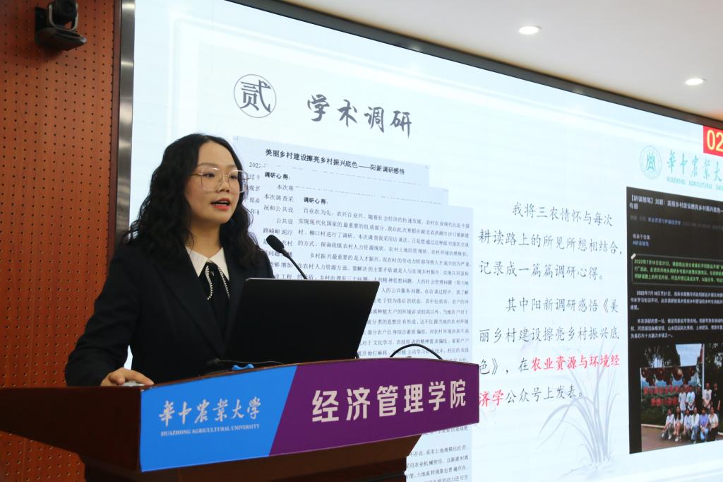 2021级农业管理硕士生刘颖在研究生期间,以通讯作者的身份在《环境保护》(CSSCI)上发表论文《“双碳”目标下的畜禽养殖绿色发展》。她积极参与创新创业大赛,获得第八届中国国际“互联网+”大学生创新创业大赛省级金奖。她多次赴黄石、襄阳、黄陂等县市调研,将三农情怀与耕读路上的所见所想相结合,记录成数篇调研心得。