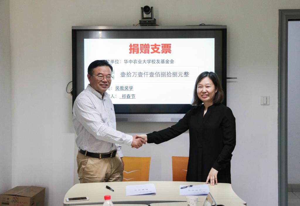 坚持在教学和社会服务双一线工作的祁春节教授同样为华农送上了自己的美好祝愿,他直言,华农于他而言如家一般亲切温暖,又比家多了一份敬重。他将人生最美好、最年富力强的十九年倾注于教育事业,培养了百余名优秀卓越的硕士生博士生,不仅为学校创造人才,也不懈地给社会创造福祉。祁教授表明,此次捐赠目的是激励学子成才,祝愿他们寻找长远的目标,树立勤奋好学的精神,探索人生的真谛。