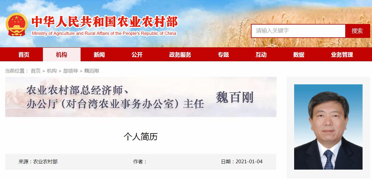 此前,农业农村部官方网站“部领导”栏目更新显示,校友魏百刚于2020年12月任农业农村部总经济师、办公厅(对台湾农业事务办公室)主任