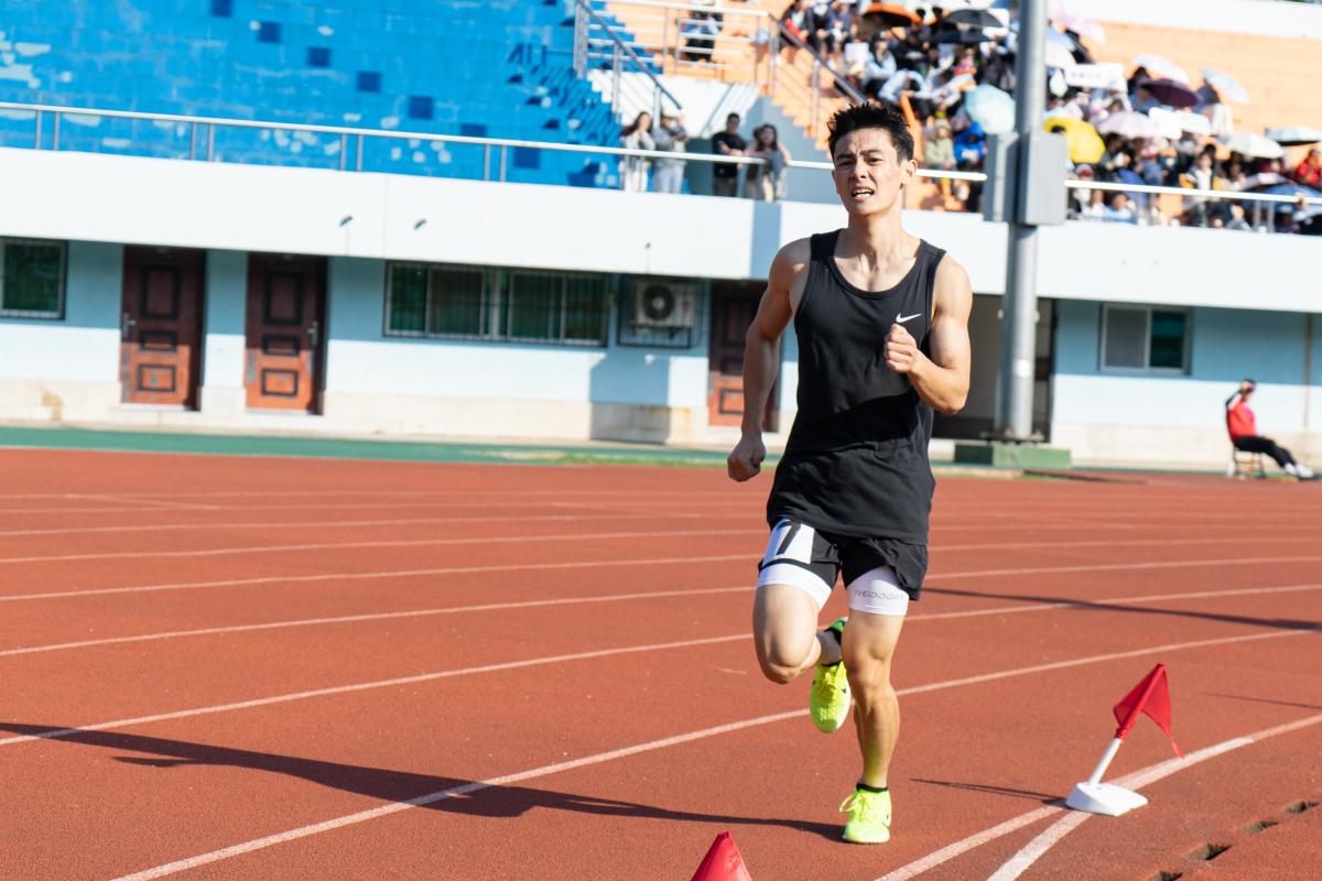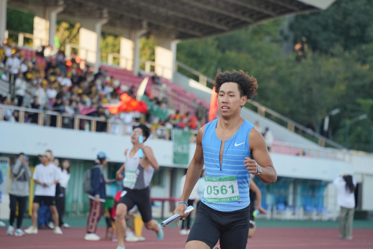 男子4x100m第一组第一名经管学生周听然冲线(丁沐嵘 摄)
