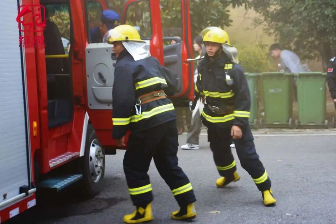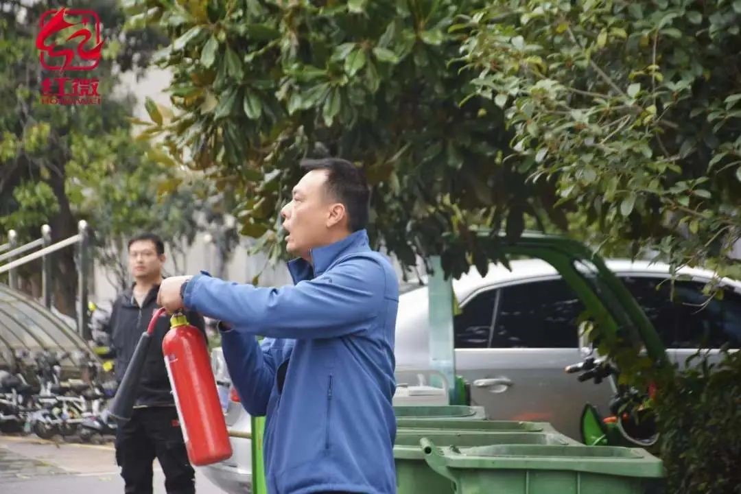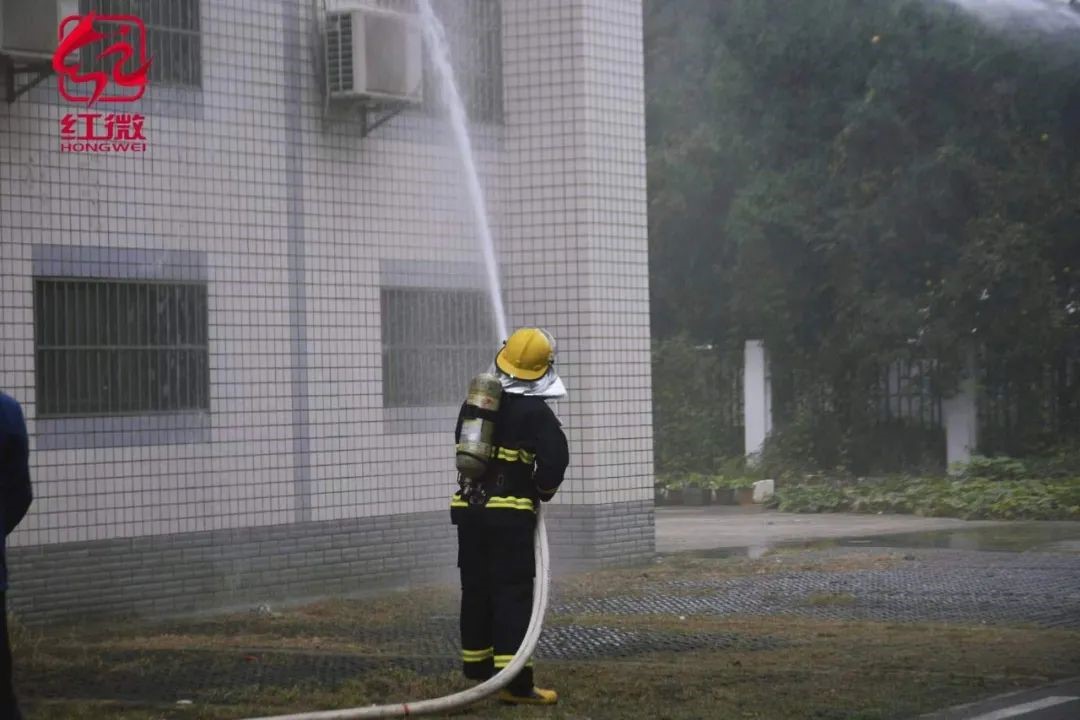 与此同时,“志愿消防队”展开灭火行动。建安部指挥调度中心同步接到火灾报警信号,迅速进行人员调度,启动应急预案参与救援,使用灭火器和水枪扑灭火灾,进行火情控制、道路管控和秩序维护,防止发生舆情事件。