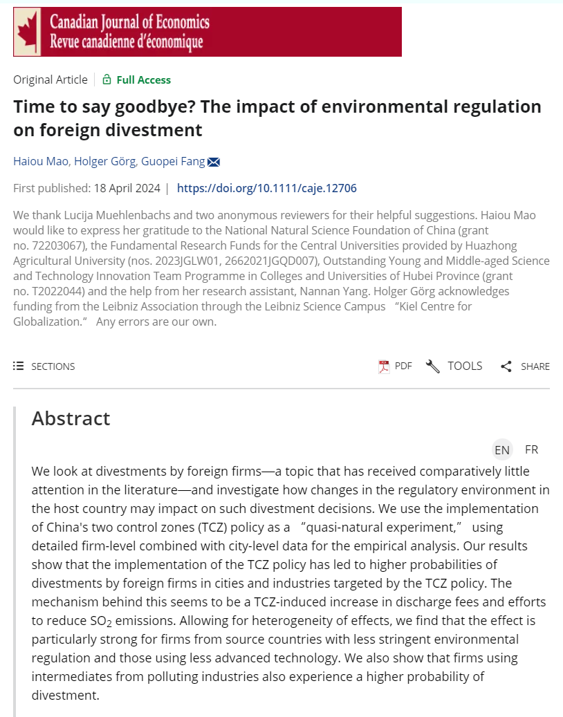 近日,我院毛海欧副教授与德国基尔世界经济研究所Holger Görg教授、华中科技大学经济学院方国培博士在经济学类权威期刊Canadian Journal of Economics发表题为“Time to Say Goodbye? The Impact of Environmental Regulation on Foreign Divestment”的论文。该研究得到国家自然科学基金(72203067)、yl6809永利官网集团自主科技创新基金(2662021JGQD007)、yl6809永利集团高水平论文培育项目(2023JGLW01)、湖北省高等学校优秀中青年科技创新团队“农业产业与技术经济”(T2022044)的资助。Canadian Journal of Economics由加拿大经济学会主办,在国际经济学界享有较高声誉和广泛认可度,是国际贸易领域公认的Field Top期刊,这也是学院近年来在国际主流经济学期刊上取得的重要突破。
