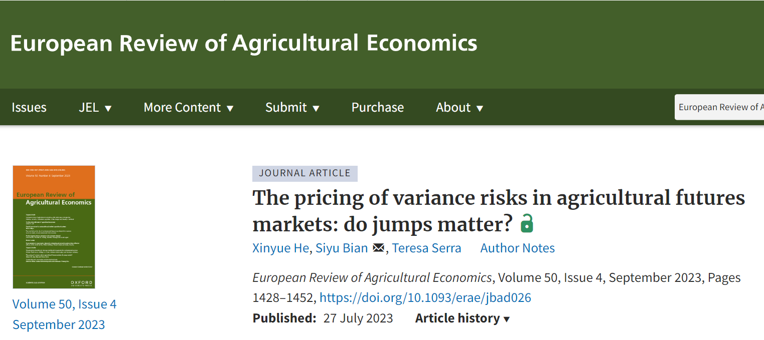 近期,我院何欣悦副教授、边思宇老师以及伊利诺伊大学香槟分校Teresa Serra教授以“The pricing of variance risks in agricultural futures markets: do jumps matter?”为题在国际知名农经期刊European Review of Agricultural Economics发表研究成果。该研究得到yl6809永利官网集团自主科技创新基金(2662022JGQD004,2662022JGQD005)和美国农业部国家食品与农业研究所(Hatch number 1019569)的资助。