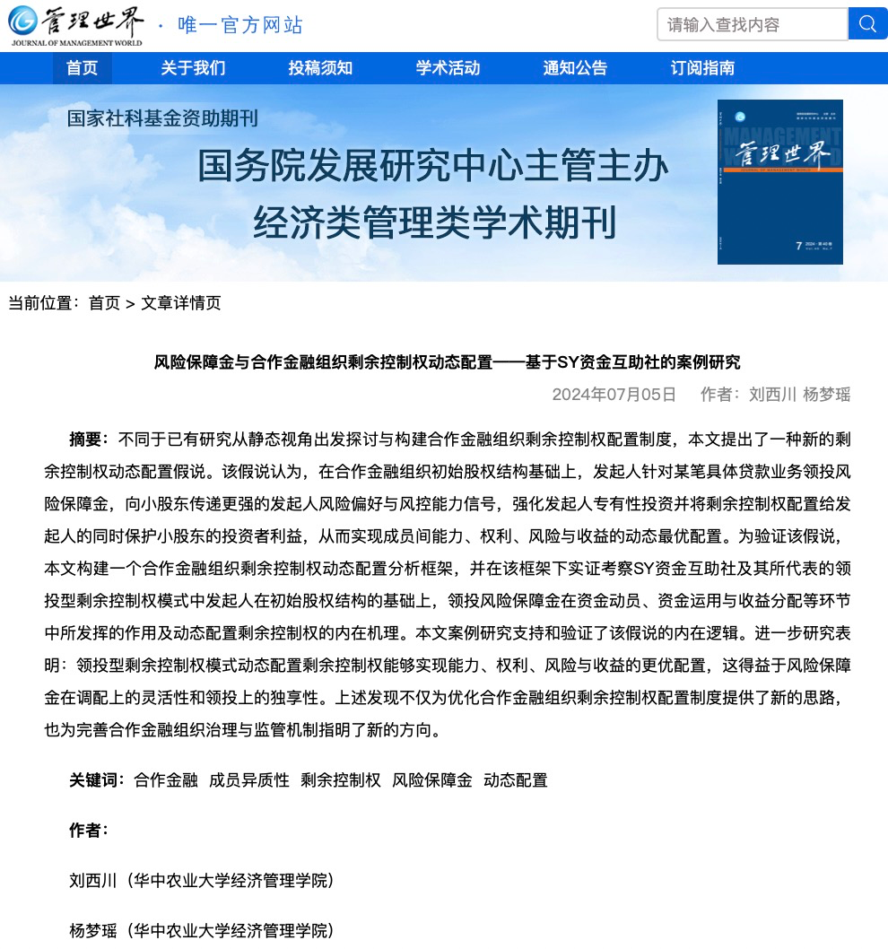 近日,我院刘西川教授与其指导的博士生杨梦瑶撰写的《风险保障金与合作金融组织剩余控制权动态配置——基于SY资金互助社的案例研究》在《管理世界》2024年第7期发表。该研究成果系刘西川教授主持的国家社会科学基金项目“脱贫地区乡村振兴金融服务模式多元联结协同创新研究”(基金号:22BGL066)、yl6809永利官网集团高层次人才启动费项目“加快建设中国特色农业金融市场体系研究”(编号:108/11042010017)和2023年度yl6809永利官网集团自主科技创新基金项目“持续推进脱贫地区乡村振兴的金融支持研究”(项目批准号:2662023JGPY001)资助的阶段性成果。