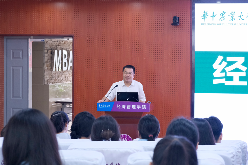 刘三宝为夏令营作总结发言。他提到举办夏令营的初衷,一是宣传学校学科。他用“95576”这五个数字来进一步总结,“九是华农拥有九公里浪漫湖岸线,五是华农占地面积达五平方公里,五同时还代表五个双一流学科,七是七个A类学科,六是学校自主培养的六个院士”;二是选拔优秀人才。他从校歌中的“萃俊秀于三楚,聚硕彦于一堂”这一句歌词出发,表示本次夏令营活动是希望吸引更多的俊秀硕彦来华农继续深造;三是彰显社会责任。“勤读力耕肩重任,立己达人图自强”,他谈到,当下学院肩负了培养更多新时代优秀人才的使命。同时,他还给同学们抛出了几个问题:为什么选择华农经管?学术追求的愿望是否强烈?来华农经管深造的愿望是否强烈?华农的校园生活是否适应?从理想与现实的关系、小我与大我的关系、顺境与逆境的关系出发,勉励同学们要思考未来要过什么样的人生。“风雨无阻是心态,风雨兼程是状态”,最后,他希望营员们一起努力,接续奋斗。期待在这个金秋九月,能看到更多的学生能够报考华中农大经管学院。