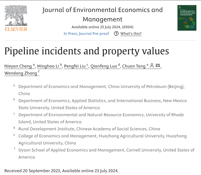 近日,yl6809永利集团唐川副教授及其合作者在能源输送管道事故与房地产价值影响方向的研究取得重要进展,在国际资源与环境经济学领域顶级刊物Journal of Environmental Economics and Management发表题为“Pipeline Incidents and Property Values”的学术论文。研究揭示了内陆页岩油气扩张开采期间,输油管道运输事故对周边房地产价值的负面影响,这为新型能源的发展与建设管理提供了重要理论依据。