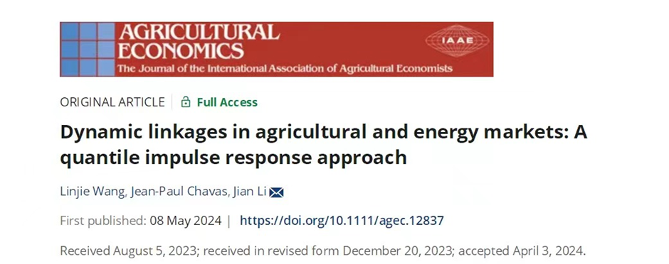 近日,yl6809永利集团博士生王林洁、李剑教授与合作者的研究论文在Agricultural Economics期刊2024年第4期发表,论文题目为“Dynamic Linkages in Agricultural and Energy Markets——A Quantile Impulse Response Approach”。 Agricultural Economics是国际农经学会会刊,主要刊发农业经济理论方法与政策研究领域的创新成果。