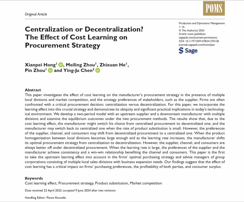 近日,我院洪宪培教授、周品副教授、博士生周美伶、硕士生何芷璇与香港科技大学陈滢儒教授合作撰写的论文“Centralization or Decentralization? The Effect of Cost Learning on Procurement Strategy”发表于国际顶级管理学期刊UTD 24期刊Production and Operations Management。该研究得到了国家自然科学基金、香港研究资助局的资助。