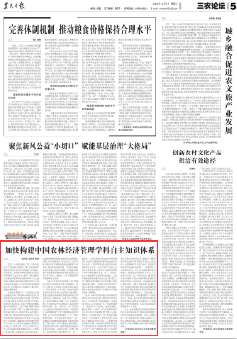 党的二十大报告指出,“深入实施马克思主义理论研究和建设工程,加快构建中国特色哲学社会科学学科体系、学术体系、话语体系”,为包括农林经济管理在内的各学科指明了发展方向,提供了根本遵循。以农林经济管理学科的教学科研工作立场来看,构建中国农林经济管理学科自主知识体系迫在眉睫,这不仅是学科发展规律的必然,也是服务乡村全面振兴、建设农业强国的重要支撑。