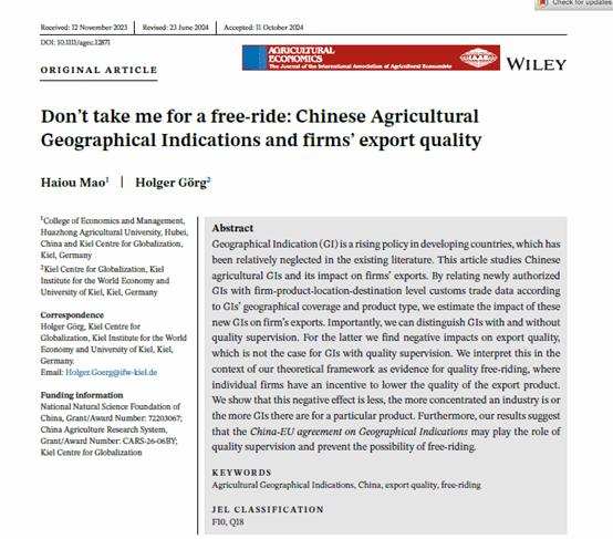 近日,我院毛海欧副教授与德国基尔世界经济研究所Holger Görg教授在国际农经学会会刊Agricultural Economics发表题为“Don’t take me for a free-ride: Chinese Agricultural Geographical Indications and firms’ export quality”的论文。