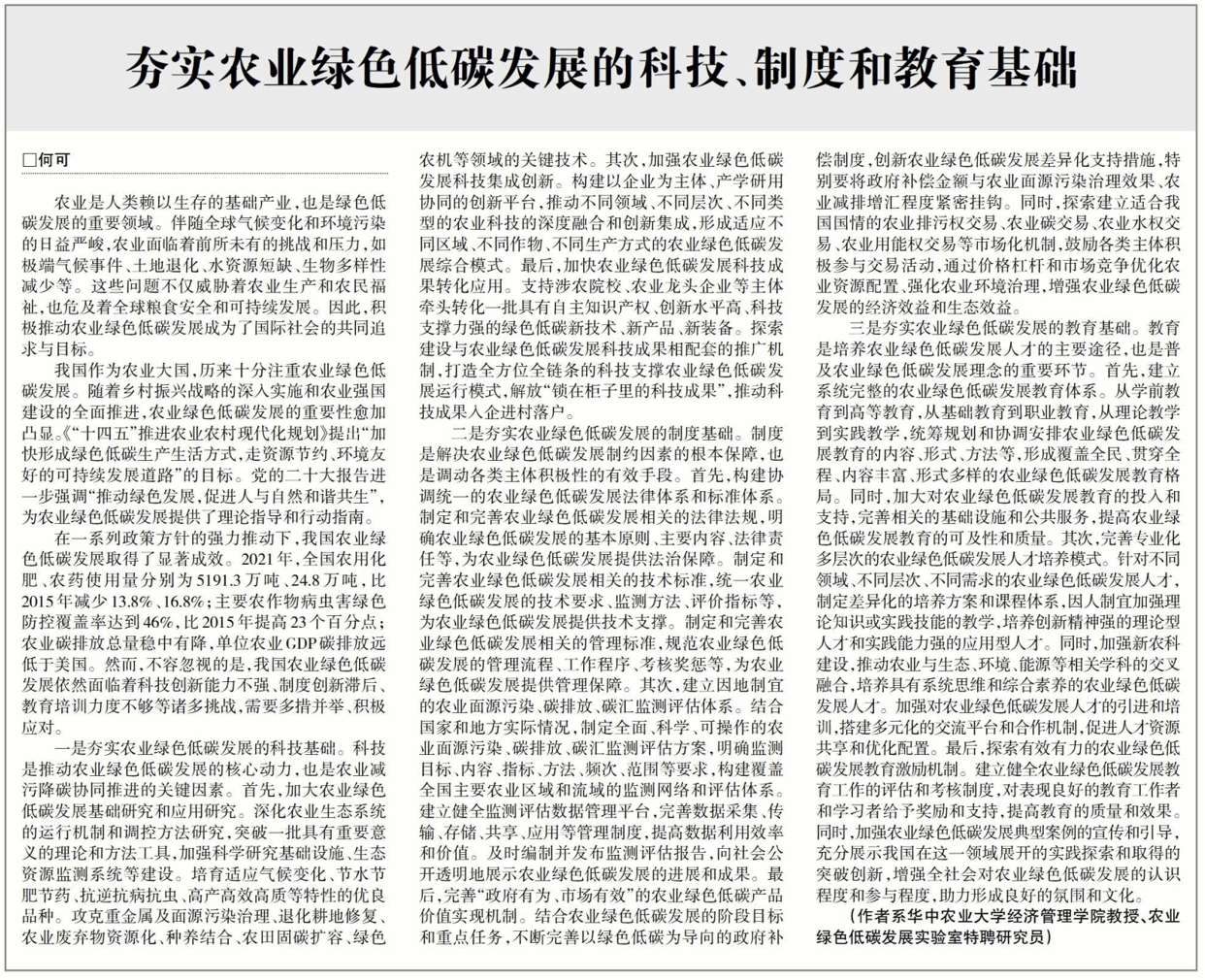 何可认为,理论的生命力在于指导实践。“学术论文如剑谱,系统阐释招式的原理与心法;资政报告如利剑,在实战中检验招式威力。唯有二者深度融合,才能避免‘纸上谈兵’的空洞,防止‘盲人舞剑’的莽撞。”他期待通过这些理论成果和政策建议,为基层探索提供方法论参考,让绿色低碳理念真正融入田间地头的变革。