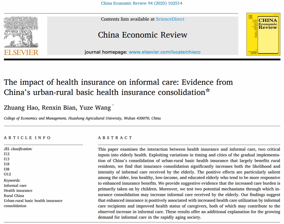 China Economic Review是国际权威经济类期刊,中科院经济学一区期刊,最新影响因子为5.5。该研究得到了国家自然科学基金(72203066、72203069)、教育部哲学社会科学研究后期资助项目(24JHQ073)、“湖北省优秀青年社科人才”专项调研课题《湖北农户医疗服务需求及其预测研究》、yl6809永利官网集团乡村振兴研究课题(2662025YJ006)的共同资助。