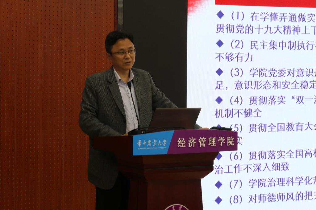 会上,院长李谷成详细介绍了第五轮学科评估的情况,对学院目前的现状进行了客观分析并对学院学科评估工作进行了部署。党委书记陈国顺向全院教职工公布了《学院党委落实2020年校内巡察反馈意见整改方案》。副院长于久霞就安全工作做出部署,要求大家做好消防安全、人身财产安全,确保各场所人走电断,不留隐患;疫情防控形势严峻,积极配合做好校园疫情防控工作;对即将到来的狮山欢乐节,她提到希望更多的老师加入到学生项目中去,加入到31号的活动,构建和谐师生关系;同时就即将到来的期中考试,要求老师们严格老师纪律,也要提醒学生端正考风考纪,诚信应考。