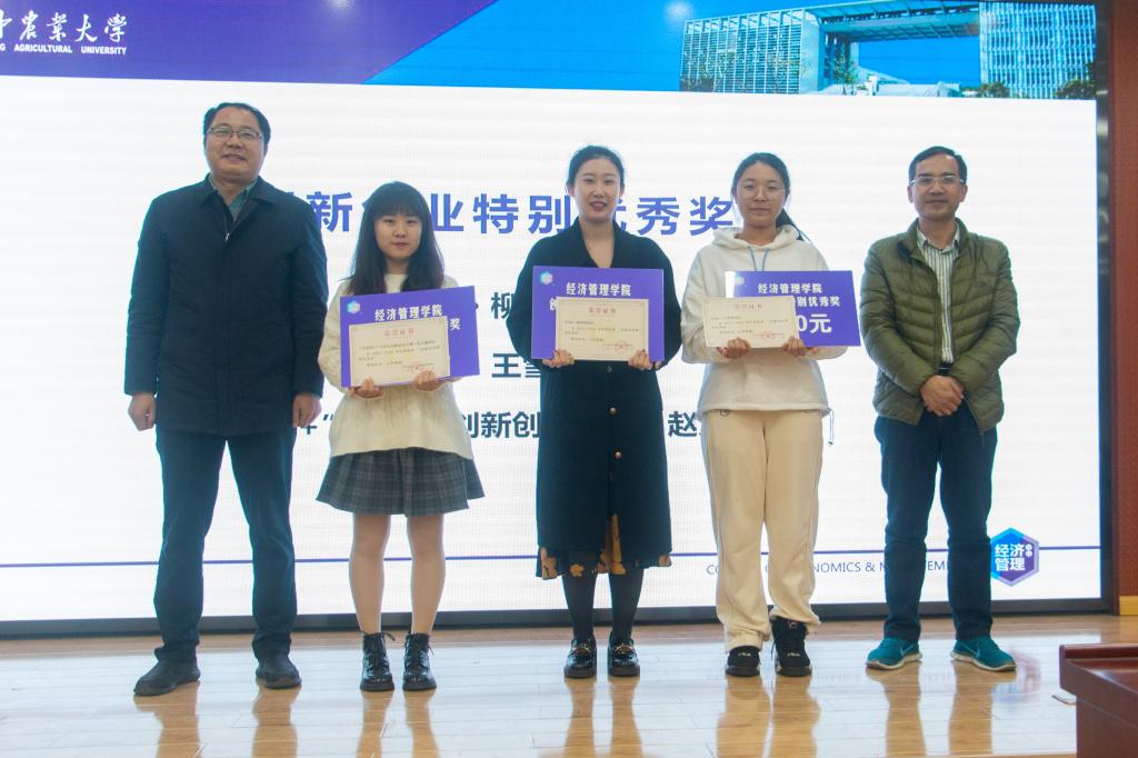 学院副院长罗小锋首先宣读了《yl6809永利集团关于表彰2021年“俊秀英才奖学金”等院设奖学金获奖团队和个人的决定》。与会嘉宾们分别为“俊秀英才奖学金”“育财荟奖学金”“达尊奖学金”“创新创业特别优秀奖”等学生获奖团队与个人颁发证书,学院党委书记陈国顺为IFAMA优秀指导教师柳鹏程颁发“创新创业特别贡献奖”证书。