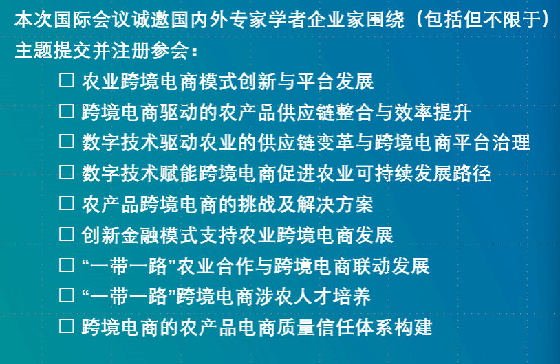 本论坛着力于汇聚来自“一带一路”沿线国家的学术研究人员、公共部门、企业代表及其他专业人士,共同探讨数字技术与跨境电商如何赋能“一带一路”农业合作与高质量发展。本次国际论坛旨在:(1)深化科研合作与学术影响力:推动跨境电商在促进“一带一路”国家农业高质量发展方面的前沿研究,激发中国与共建国家学者间的深度交流与广泛科研合作,提升该领域的学术水平与国际影响力。(2)构建产业网络与社会影响力:促进中国与共建国家农业产业链上下游(包括科技、金融、物流等环节)的跨国、跨区域对接,助力形成基于绿色发展的农产品贸易网络,扩大先进农业实践与跨境电商模式的社会应用与示范效应,带动农民可持续增收。(3)打造政策智库与公共影响力:深入研讨农业绿色发展、数字贸易便利化、跨境政策协同等关键议题,形成具有前瞻性和可操作性的政策建议,使论坛成为服务中国“一带一路”农业对外开放政策及共建国家相关公共政策制定的重要智库和对话平台。(4)推动共同繁荣:通过促进知识共享、经验交流与务实合作,探索互利共赢的新型合作模式与实施路径,为实现“一带一路”沿线国家农业现代化、可持续发展和构建人类命运共同体的宏伟目标贡献智慧和力量。