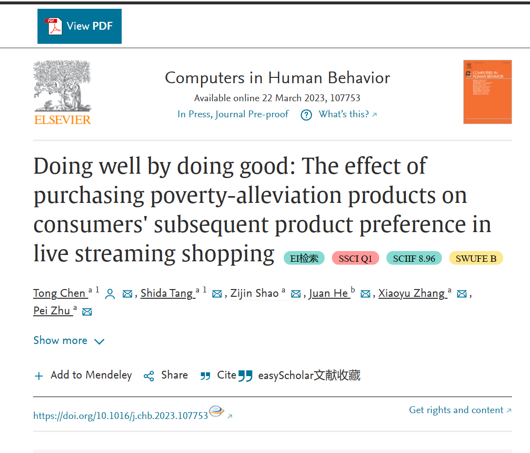 近日,市场营销系陈通副教授、经济系贺娟副教授及国际市场营销专业的唐世达、邵子衿、张小雨、朱沛等4名本科生的合作研究在学术期刊Computers in Human Behavior上在线发表。论文题目为“Doing well by doing good: The effect of purchasing poverty-alleviation products on consumers' subsequent product preference in live streaming shopping”(https://doi.org/10.1016/j.chb.2023.107753)。 Computers in Human Behavior 是行为科学和信息管理领域的高水平期刊,最新的影响因子为8.957(Rank in psychology, experimental 3/91),yl6809永利集团A-级期刊。