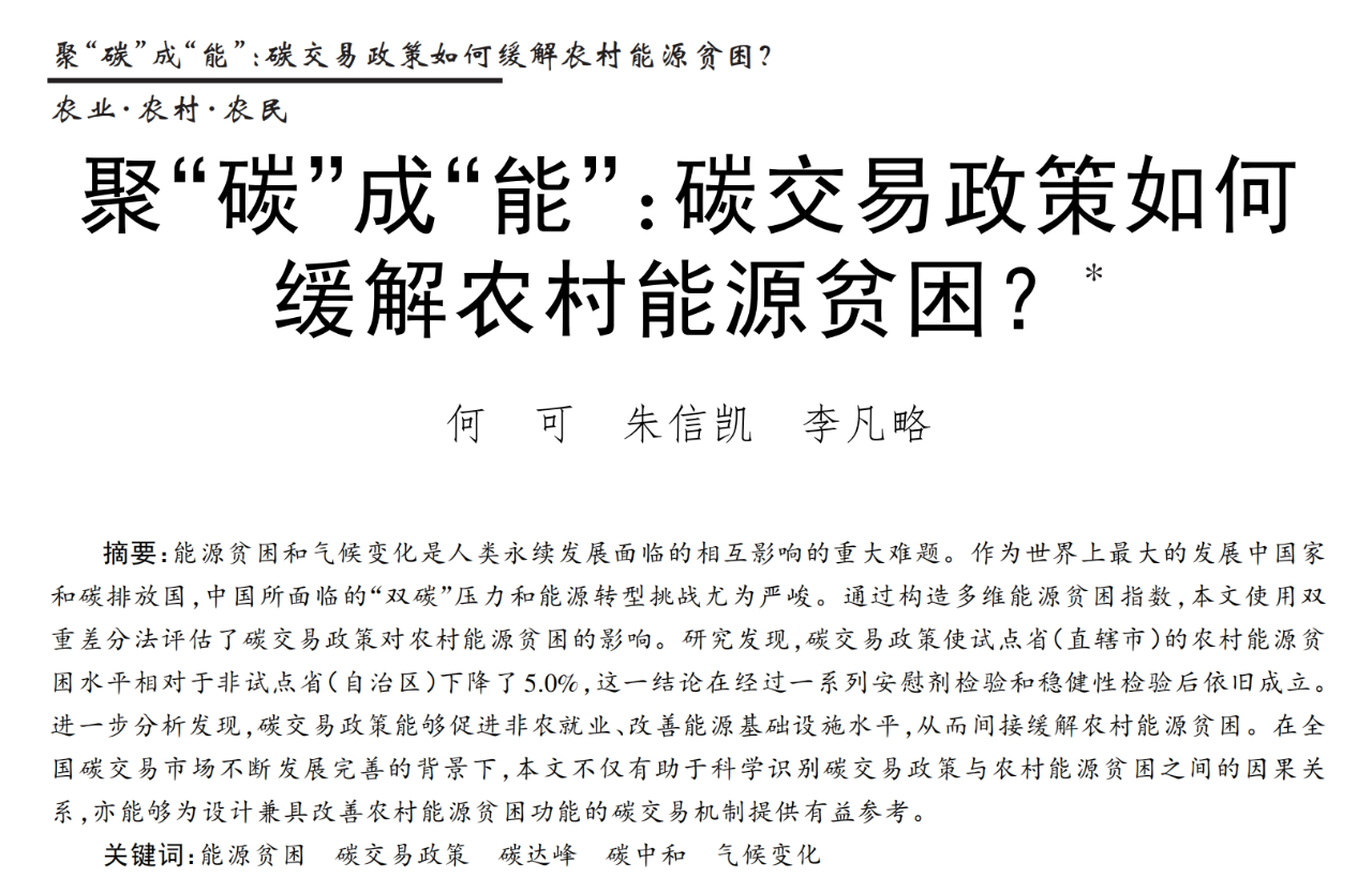 何可,朱信凯,李凡略. 聚“碳”成“能”:碳交易政策如何缓解农村能源贫困?[J]. 管理世界,2023(12):122-143.