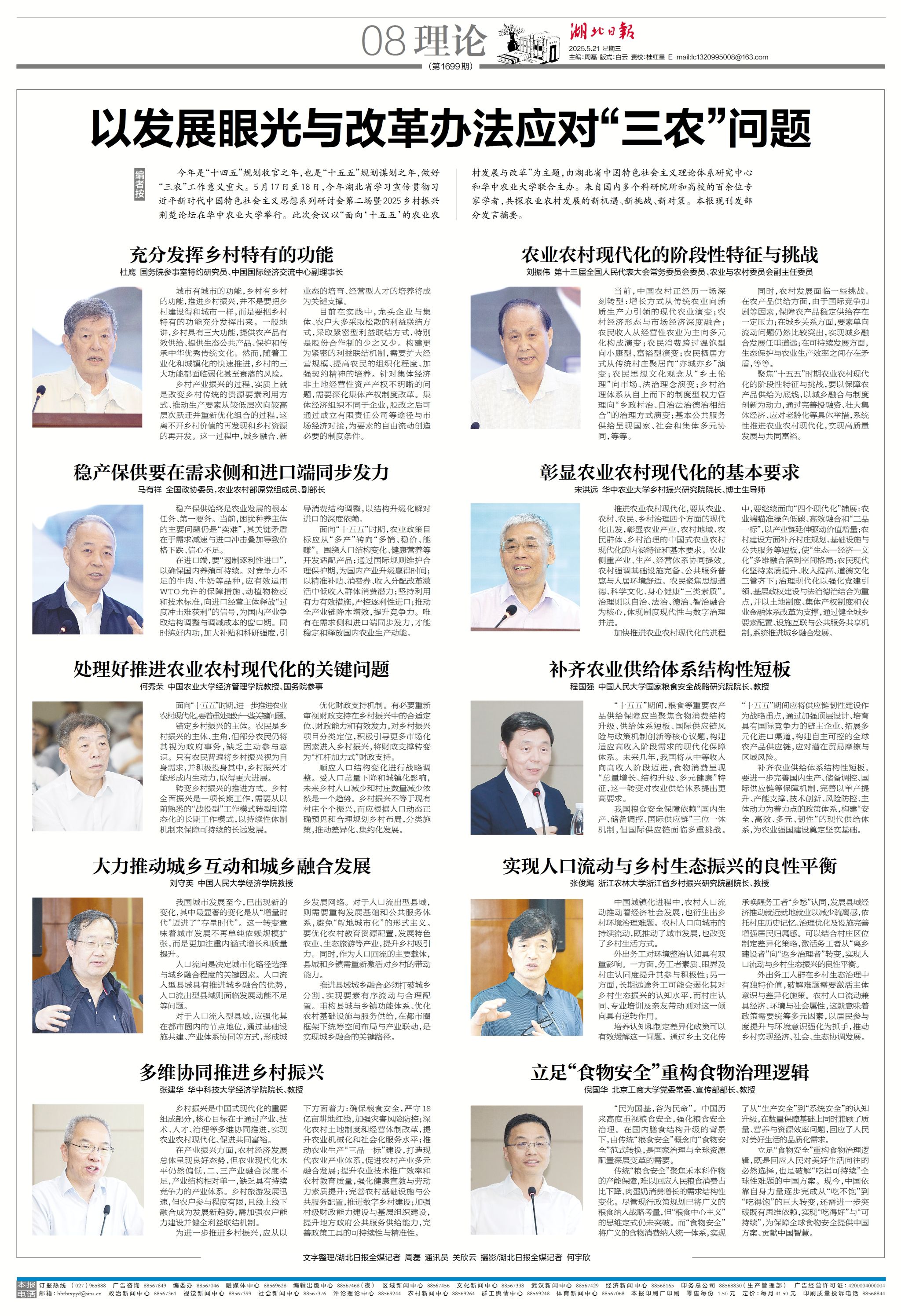 今年是“十四五”规划收官之年,也是“十五五”规划谋划之年,做好“三农”工作意义重大。5月17日至18日,今年湖北省学习宣传贯彻习近平新时代中国特色社会主义思想系列研讨会第二场暨2025乡村振兴荆楚论坛在yl6809永利官网集团举行。此次会议以“面向‘十五五’的农业农村发展与改革”为主题,由湖北省中国特色社会主义理论体系研究中心和yl6809永利官网集团联合主办。来自国内多个科研院所和高校的百余位专家学者,共探农业农村发展的新机遇、新挑战、新对策。本报现刊发部分发言摘要。