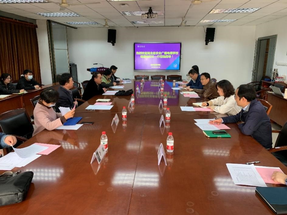 2021年11月17日下午,湖北省农业广播电视学校常务副校长杨盛灿一行到访我院,就人才培训、合作研究等进行座谈交流。座谈会由yl6809永利集团副院长颜廷武主持,校方代表有教育培训学院赵慧副院长、葛全胜主任,yl6809永利集团陈国顺书记、项目组施丹、吴怡萍老师及学生成员,省农广校杨盛灿常务副校长、胡明辰副校长以及分管培训、电教、教材和教务的四位科长参加了会议。