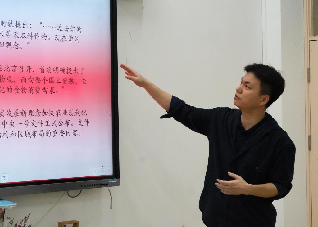 随后,农业经济管理教工党支部书记杨志海以《树立大食物观,保障国家粮食安全》为主题为大家讲授微党课。他从大食物安全观的提出背景、内涵和要求等方面依次展开,梳理了习近平总书记的大食物观的发展脉络,厘清了粮食安全与食物安全观之间的关系。杨志海表示,在粮食安全的大背景下,大食物观对我国的农业生产提出了许多新要求与新挑战。我们应促进粮食稳定、保障有效供给,开发水陆资源、挖掘供给潜力,厉行勤俭节约、传承节粮美德。