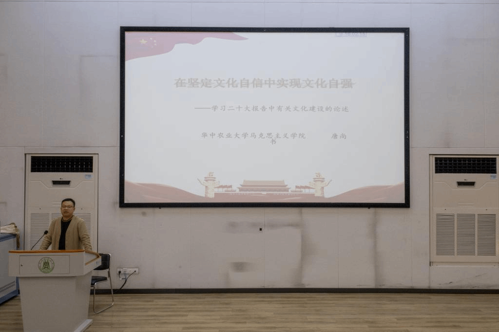 3月30日下午,yl6809永利集团在三教S1报告厅开展党的二十大精神“精读精讲”专题学习。学校党的二十大精神“精读精讲”宣讲团成员、马克思主义学院青年教师唐尚书应邀作“在坚定文化自信中实现自信自强”的报告,学院各本科生党支部党员代表及入党积极分子300余人参加学习。