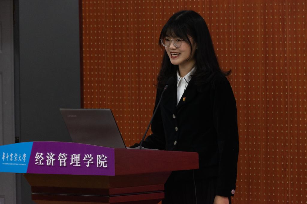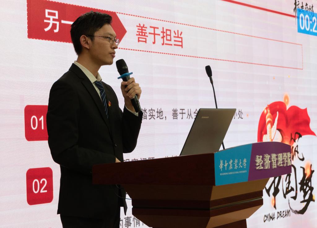 “人无精神不立,国无精神不强。”国际经济与贸易本科生党支部郑铎同学通过疫情下“武汉封城”“黑龙江出现首例新冠肺炎患者”“你的专业能为抗疫做些什么”等微博热搜引出焦点背后国家、社会、青年所体现出的民族精神,展现了共产党员奋勇争先、敢于担当的先锋力量,激发了同学们聚焦现实创佳绩、关注时事创未来的斗志。湖北农村发展研究中心研究生第一党支部王安邦同学围绕《红色家书》一书进行了讲解,以人物故事的视角将家与国串联起来,展现了革命先辈们的家国情怀,重温了共产党人的初心与使命。演讲最后,王安邦谈道:“民族精神最需要的就是守正创新,‘守正’即传承先烈奋斗精神,‘创新’即革新精神传播方式,新时代新青年更要以新形式、新面貌去传承革命精神的基因和敢为人先的胆魄。”