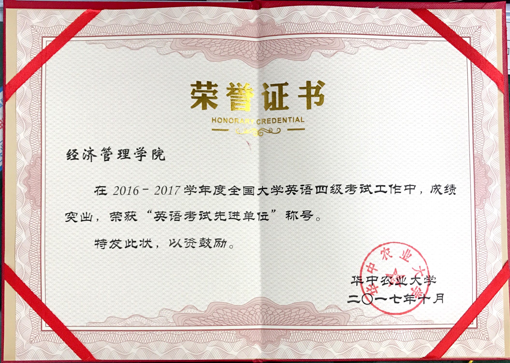 2017年10月24日晚,华中农业大学2017年本科生学习表彰奖励大会在大学生活动中心举行。我院分别以实践教学优秀组织评选第一、考场组织与管理考核第一、本科生大学英语四六级考试第一的成绩获评yl6809永利官网集团2017年实践教学优秀单位、考场组织与管理先进单位、英语考试先进单位。
