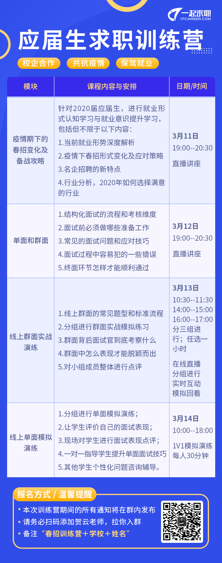 同学们,2020年春招,因受疫情影响,绝大多数公司应对新形势、新变化,着手空中招聘,作为应届生的你是否对空中招聘充满紧张和忧虑呢?你该如何准备线上面试、成功突围最难就业季呢?一起求职将于3月11日至3月14日开展线上求职训练营,具体内容为: