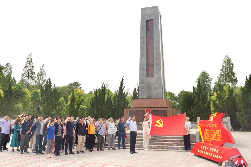 老街的背后,是湘鄂西苏区革命烈士陵园,纪念着数以万计的为建立和保卫共和国壮烈牺牲的烈士。全体教工党员在此进行了简短而庄严的纪念仪式,以默哀礼和三鞠躬的方式向烈士们表达最深沉的敬意,向烈士纪念碑敬献花圈,感悟“艰苦奋斗、百折不挠、勇往直前、战胜每一个困难”的洪湖精神,并在纪念碑前面对党旗,重温入党誓词,再一次庄重地表达了对党忠诚、为党和人民奋斗终身的决心。